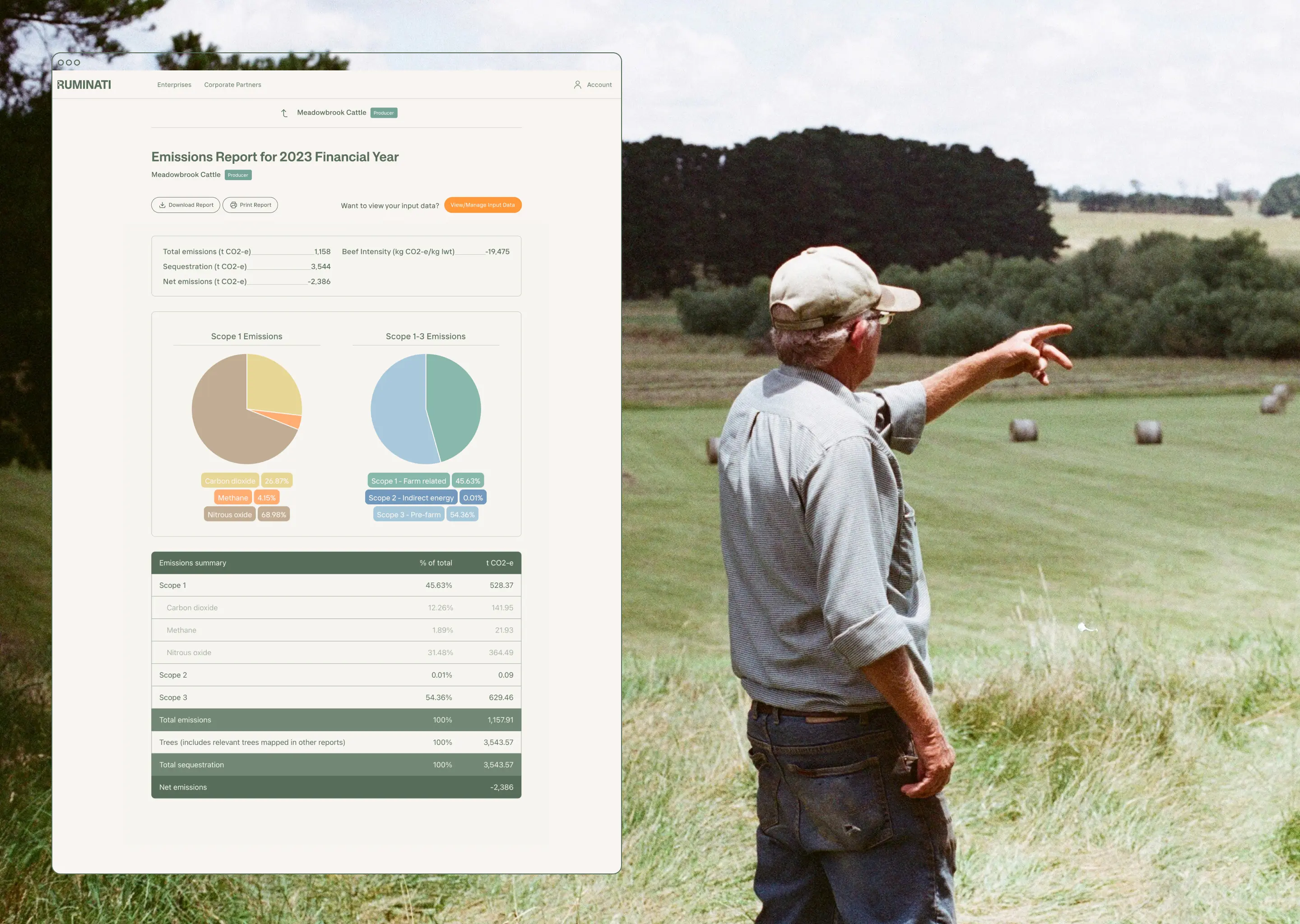 Ruminati is a new climate solution tool built by farmers, for farmers. It gives producers the power to quickly calculate their emissions data on a single platform, and share it with organisations across the supply chain. Working closely with founders and cattle farmers Will Onus and Bobby Miller, we’re spearheading a sustainable agricultural movement to propel Australia towards Net Zero.
